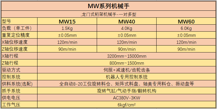 MW系列機(jī)械手作為長(zhǎng)行程機(jī)械手,采用龍門(mén)式立柱機(jī)構(gòu)加鋼梁組成,可同時(shí)搭配多套Z軸模塊,具備同時(shí)與多臺(tái)數(shù)控機(jī)床聯(lián)機(jī),可實(shí)現(xiàn)產(chǎn)品從毛坯到成品的自動(dòng)化生產(chǎn),當(dāng)設(shè)備加配在線檢測(cè)、在線打標(biāo)、在線讀取等設(shè)備后,可完成監(jiān)控每一個(gè)零件的生產(chǎn)過(guò)程,是組建數(shù)字化無(wú)人工廠的利器。該系列機(jī)械手實(shí)用于工件的多工序加工。