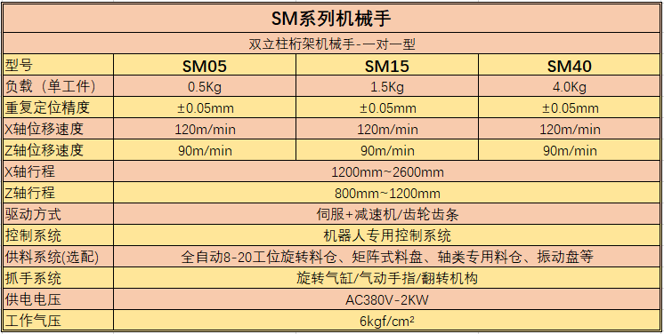 SM系列機(jī)械手主要針對單臺數(shù)控機(jī)床自動上下料配置,靈活性強(qiáng)。適合多批次工件使用。同時(shí)該系列機(jī)械手也可以組成多套設(shè)備聯(lián)線。實(shí)現(xiàn)低成本高效率自動化模式